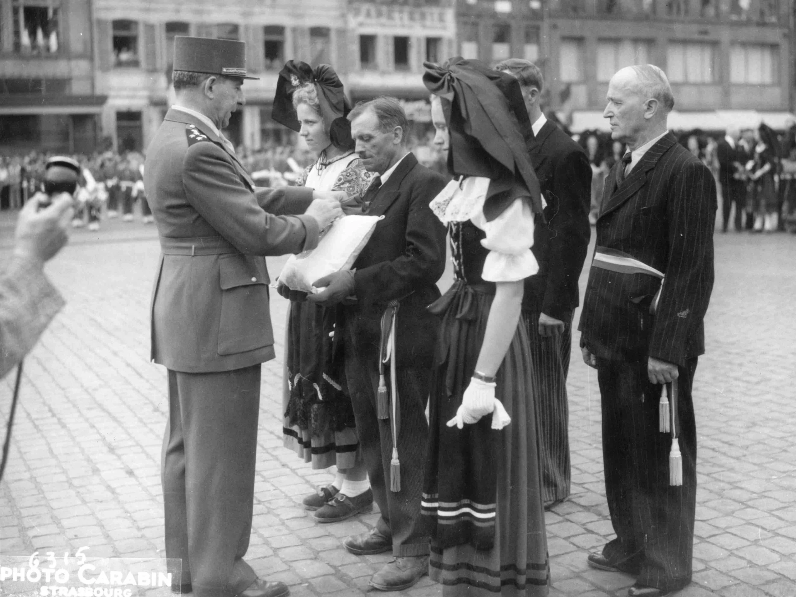 Remise par le général DE LATTRE DE TASSIGNY de la Croix de Guerre du Régiment à la commune de DIEBOLSHEIM, le matin du 14 Juillet 1949, lors d’une prise d’armes place KLEBER à STRASBOURG. La Croix de Guerre 39–45 a été attribuée à 26 communes dans le Bas-Rhin et à 38 dans le Haut-Rhin.